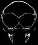 Although the adaptations of different genera are reflected in their craniodental anatomy, platyrrhines in general retain a cranial morphology more similar to primitive anthropoids from the Eocene and Oligocene of Egypt such as Catopithecus, Parapithecus, and Aegyptopithecus than do the living Old World anthropoids (Fleagle, 1999; Simons, 2001).  The research for which these CT data were collected indicates that this primitive anthropoid cranial morphology included considerable cranial pneumatization via the paranasal sinuses.  |