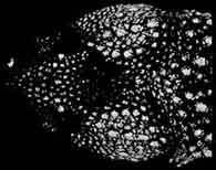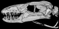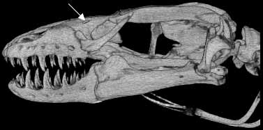 The second feature newly revealed by this scan is that Lanthanotus possesses a palpebral bone, a bone in the anterodorsal corner of the orbit (see below). This bone was overlooked previously because it is very reduced and isolated in soft tissue in this taxon -- thus, when specimens were skeletonized, the palpebral was lost. Both the osteoderms and palpebral in Lanthanotus are fully described in a recently published paper (Maisano et al., 2002).