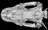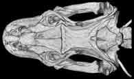 This scan revealed two features previously unknown in Lanthanotus. The first is the full extent of osteoderms (bones embedded in the skin) around the skull. In McDowell and Bogert's (1954) landmark study, an X-radiograph of Lanthanotus revealed only the most robust osteoderms on the dorsal aspect of the head. But as shown in the "skeleton only" animations above, Lanthanotus possesses a much more extensive array of osteoderms than could be detected by conventional X-radiography. Three-dimensional renderings isolating the osteoderms and the skull can be found in "additional imagery".