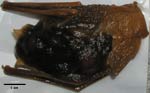 During scanning of the whole skeleton, it was discovered that this female specimen contained a single, well-developed embryo, which can be viewed on its own page here. Thyroptera tricolor breeds twice annually and mating is known to be polygonous. The young are unable to fly for the first month and so after birth the mother will carry her single offspring in flight, with the baby clinging to her abdomen (Anderson and Jones 1984).