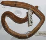 Amphisbaenians, like other squamates, have paired evertible hemipenes, a transverse cloacal slit, and shed their skin in its entirety. They differ in that they have a highly modified skull architecture, a unique modification of the ear called the extracolumella, and skin with annuli (rings, like a worm -- hence the common name). |