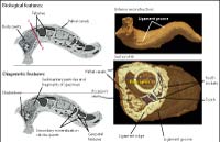 Caprinuloidea perfecta is highly inequivalved. The right or attached valve is long and curved with a slight rotational twist. The cross-section is close to quadrilateral. The free, or left valve, is much smaller and coiled and is crushed in this specimen. The shell structure includes ventrally trifurcating marginal plates cut by radial plates to form two rows of polygonal canals (coronal slice127). The body cavity is slightly off center, with anterior and posterior tooth sockets separated by the ligament ridge on the dorsal side. The ventral side is thus the thinner side of the skeleton and perhaps the recumbent side or attached side. (coronal slice1205) The ligament groove is external (surface roll movie) and attaches on the ligament ridge.