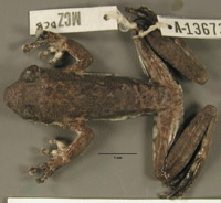 This specimen was collected from the Mangombe Forest Reserve, east of Samakeke, Cameroon by D.C. Blackburn, J. Diffo and N. Gonwouo on 5 September 2004. It was made available to the University of Texas High-Resolution X-ray CT Facility for scanning by Dr. James Hanken of Harvard University. Funding for scanning was provided by an NSF grant (DEB-0345885) to Dr. Hanken, and funding for image processing was provided by an NSF Digital Libraries Initiative grant to Dr. Timothy Rowe of The University of Texas at Austin.