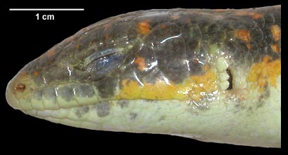 This frozen specimen originated in the pet trade and no locality information is available. It was made available to the University of Texas High-Resolution X-ray CT Facility for scanning by Dr. Jessie Maisano of The University of Texas and Dr. Jacques Gauthier of Yale University. Funding for scanning was provided by an NSF grant (DEB-0132227) to Dr. Jack Sites of Brigham Young University. Funding for image processing was provided by a National Science Foundation Digital Libraries Initiative grant to Dr. Timothy Rowe of The University of Texas at Austin.