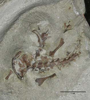 The specimen is generally well preserved in three dimensions, with the vertebrae fully articulated, but there has been some disarticulation of the limbs and girdles and of parts from the right side of the skull roof and jaws. It is not possible to get an accurate measurement of the snout-sacral length, but comparison of humeral and femoral lengths with those of similarly proportioned modern analogues suggests a snout-sacrum length of 50-60mm, and a total length (with tail) of between 80-100mm overall. Despite this small size, the specimen appears to represent a metamorphosed individual (dermal roofing bones ossified and in position; squamosal full size; all bones of lower jaw ossified; dorsal process of maxilla ossified; vomer fully formed; otic capsule complete and stapes ossified [Rose, 2003]).