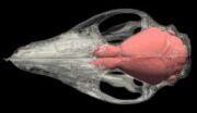 Roll spin isosurface movie showing the cranial endocast with the skull rendered somewhat transparent. Click on thumbnail to view movie.